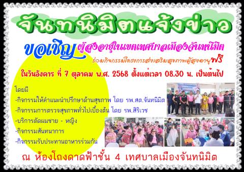ขอเชิญผู้สูงอายุในเขตเทศบาลเมืองจันทนิมิต ร่วมกิจกรรมโครงการส่งเสริมสุขภาพผู้สูงอายุฟรี