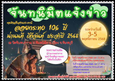 เทศบาลเมืองจันทนิมิต ขอเชิญสืบสานประเพณี ลอยกระทง 106 ปี น่านนที วิถีจันท์ ประจำปี 2568