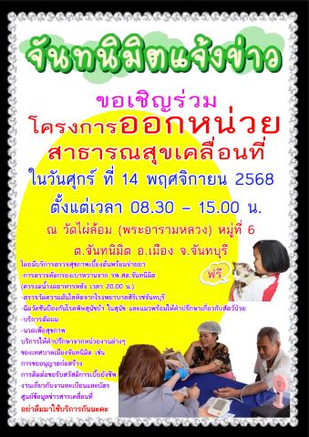 เทศบาลเมืองจันทนิมิต ขอเชิญผู้สนใจเข้าร่วมโครงการ ออกหน่วยสาธารณสุขเคลื่อนที่ ในวันศุกร์ ที่ 14 พฤศจิกายน 2568 ตั้งแต่เวลา 08.30 – 15.00 น.