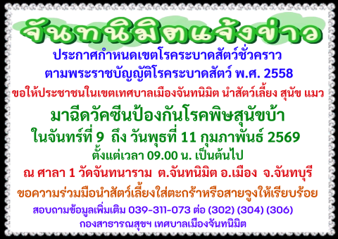 ให้ประชาชน ในเขตเทศบาลเมืองจันทนิมิต นำ สุนัข และแมว มาฉีด วัคซีนป้องกันโรคพิษสุนัขบ้า