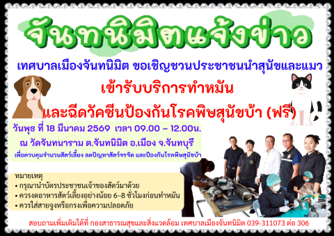 เทศบาลเมืองจันทนิมิต ขอเชิญชวนประชาชนนำสุนัขและแมวเข้ารับบริการ ทำหมัน และฉีดวัคซีนป้องกันโรคพิษสุนัขบ้า (ฟรี) ในวันพุธ ที่ 18 มีนาคม 2569 เวลา 09.00 – 12.00 น. ณ วัดจันทนาราม ต.จันทนิมิต อ.เมือง จ.จันทบุรี เพื่อควบคุมจำนวนสัตว์เลี้ยง ลดปัญหาสัตว์จรจัด และป้องกันโรคพิษสุนัขบ้า