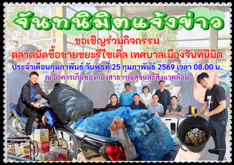 ขอเชิญร่วมกิจกรรมตลาดนัดซื้อขายขยะรีไซเคิล เทศบาลเมืองจันทนิมิต