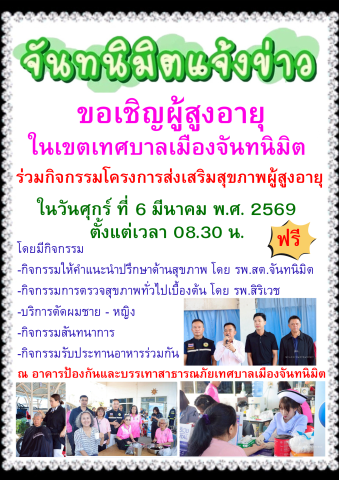 ขอเชิญผู้สูงอายุในเขตเทศบาลเมืองจันทนิมิต ร่วมกิจกรรมโครงการส่งเสริมสุขภาพผู้สูงอายุฟรี