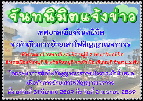 เทศบาลเมืองจันทนิมิตจะดำเนินการย้ายเสาไฟสัญญาณจราจร บริเวณแยกร้านทองจันทนิมิต หมู่ที่ 2 ตำบลจันทนิมิต อำเภอเมืองจันทบุรี จังหวัดจันทบุรี ขาเข้าเมืองจันทบุรี จำนวน 2 ต้น โดยจะทำการตัดไฟสัญญาณจราจรช่วงขาเข้าทั้งหมด เพื่อทำการย้ายเสาไฟสัญญาณจราจร ตั้งแต่วันที่ 31 มีนาคม 2569 ถึง วันที่ 2 เมษายน 2569