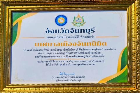 นายคมจักร ถาวรวิริยะนันท์ นายกเทศมนตรีเมืองจันทนิมิต มอบหมายให้ นางสาวน้ำเพชร น่วมสวัสดิ์ ผู้อำนวยการกองสาธารณสุขและสิ่งแวดล้อม เข้าร่วมกิจกรรมอบรมเชิงปฏิบัติการ “จังหวัดจันทบุรีกับกลไกการสร้างความร่วมมือโดยยึดหลัก BCG Model เพื่อมุ่งสู่การเป็นสังคมคาร์บอนต่ำ” ทั้งนี้จังหวัดจันทบุรีได้มอบเกียรติบัตรให้เป็นเกียรติแก่เทศบาลเมืองจันทนิมิต ซึ่งเป็นองค์กรต้นแบบด้านสิ่งแวดล้อมของจังหวัดจันทบุรี ซึ่งเสียสละและอุทิศตนในการทำงานด้านการอนุรักษ์ และฟื้นฟูทรัพยากรธรรมชาติ และสิ่งแวดล้อม การจัดการผลกระทบจากการเปลี่ยนแปลงสภาพภูมิอากาศในท้องถิ่น